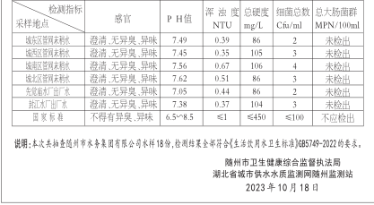 湖北省城市供水水質(zhì)監(jiān)測網(wǎng)隨州監(jiān)測站、隨州市衛(wèi)生健康綜合監(jiān)督執(zhí)法局根據(jù)《城市供水水質(zhì)管理規(guī)定》聯(lián)合于2023年10月17日對(duì)隨州市水務(wù)集團(tuán)有限公司先覺廟水廠和封江水廠出廠水和16個(gè)管網(wǎng)末稍水水質(zhì)進(jìn)行了抽樣監(jiān)測,現(xiàn)將抽查檢測結(jié)果公告如下: