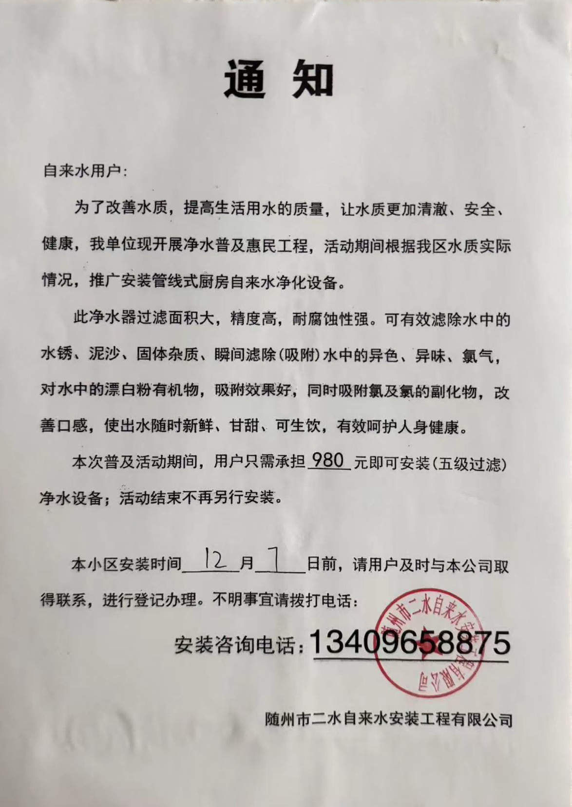 如發(fā)現(xiàn)以隨州市水務(wù)集團(tuán)有限公司或自來水廠名義推銷凈水器的人員請(qǐng)向我公司舉報(bào),我公司將依法追究法律責(zé)任。請(qǐng)廣大用戶提高警惕,切勿上當(dāng),如有疑問可直接撥打我公司24小時(shí)服務(wù)熱線0722-3318118進(jìn)行咨詢。