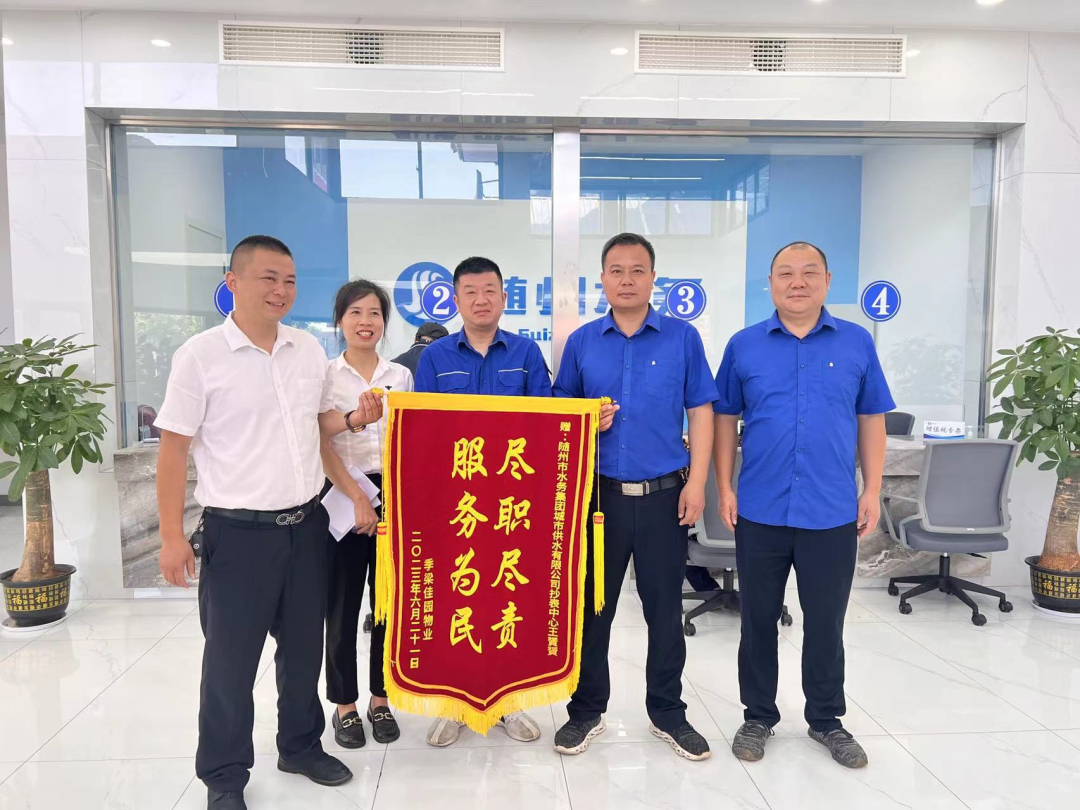 季梁佳園物業(yè)將一面錦旗送到城市供水公司工作人員手中,以表達對該公司供水服務的深深感激之情。錦旗上印著“盡職盡責 服務為民”八個大字,表達了物業(yè)和用戶對營抄中心的王赟赟等工作人員提供的認真高效、熱情周到的優(yōu)質服務表示高度贊揚和誠摯的感謝!
